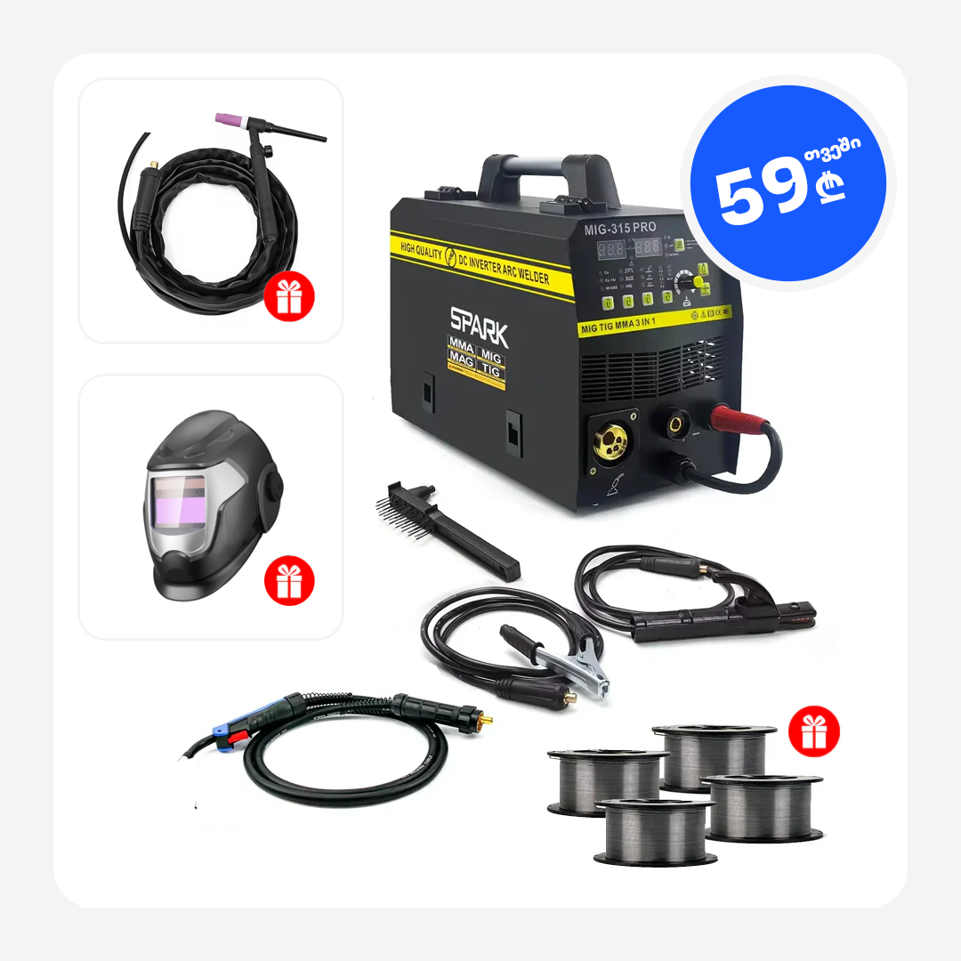 საჩუქრად 4 ცალი FLUX მავთული 1კგ - ჯამში 4კგ, TIG ჩირაღდანი კომპლექტით და ქამელეონის ნიღაბი.