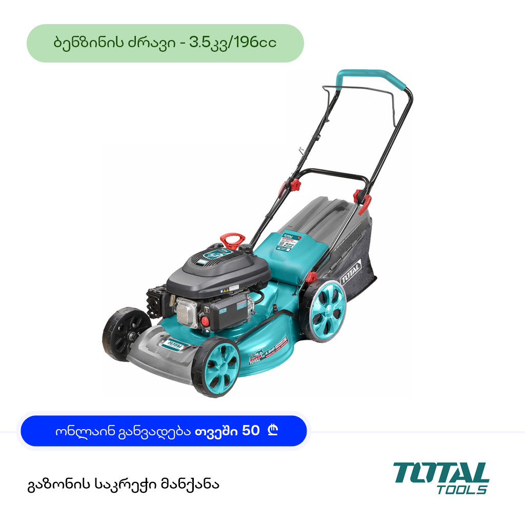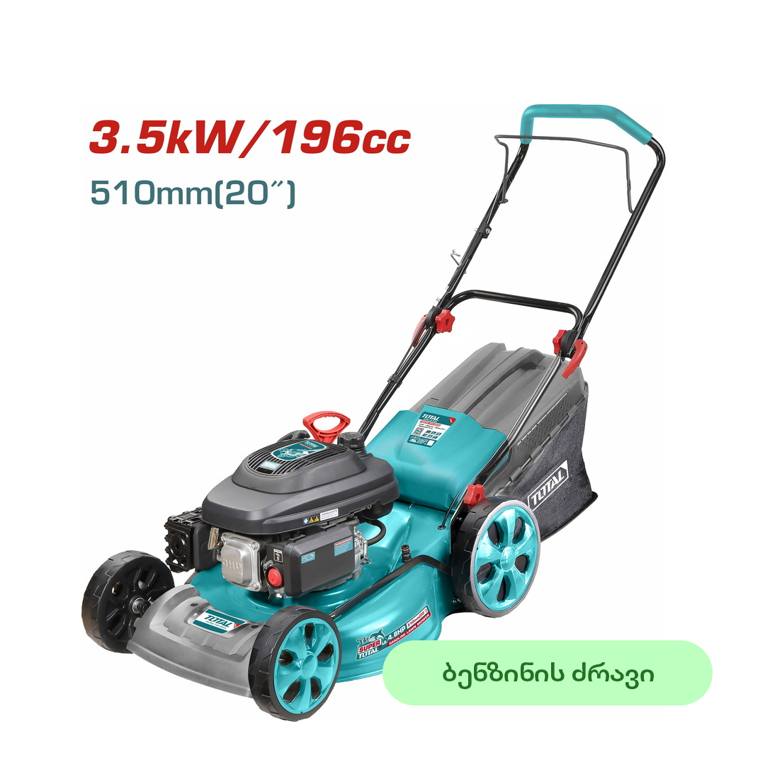 გაზონის სათიბი (ბენზინის ძრავზე) TOTAL TGT196201 (3,5კვტ, 510მმ) განვადებით, გარანტიითა და ადგილზე მიწოდებით მთელი საქართველოს მასშტაბით. აღნიშნული პროდუქტი არის ბალახის სათიბი მანქანა, რომელიც მუშაობს ბენზინის ძრავზე და ბენზინის ავზის მოცულობა 60 ლიტრია. მოცემულ მოდელს აქვს ჭრის 7 პოზიცია და შესაძლებელია მისი რეგულირება სურვილისამებრ. გაზონის სათიბს აქვს ფოლადის ჩარჩო და დამზადებულია მაღალხარისხიანი მასალისგან. TOTAL-ის პროდუქციის ხარისხი აღიარებულია ექსოერტთა მიერ, გამოირჩევა ერგონომიული დიზაინით, ხელმისაწვდომი ფასებით და სარგებლობს მომხმარებელთა მაღალი სანდოობით.